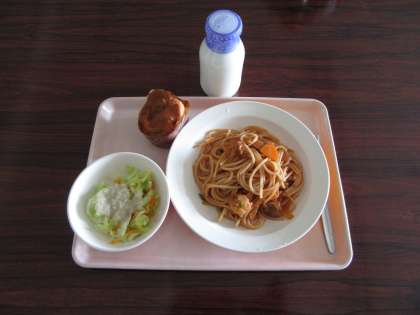 スパゲッティナポリタン オレンジジュース コールスローサラダ りんごマフィン