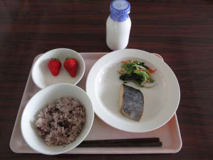 赤飯(せきはん) 牛乳 くだもの(いちご) さわらの西京焼き 野菜のごま和え