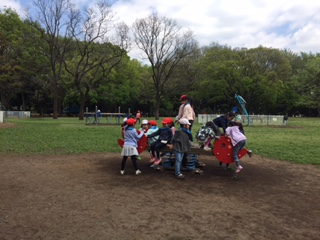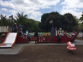 お昼を食べたら、楽しい遊具で思いっきり遊んでいます。海賊船に潜ったり、シーソーやブランコを譲り合って楽しみます。
