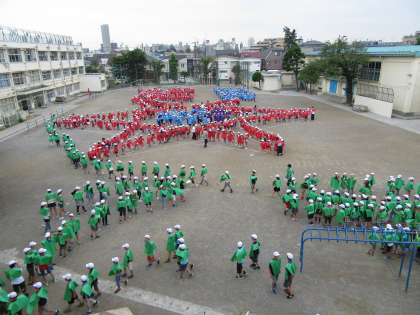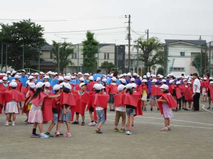 本日は、周年記念で航空写真を撮りました。赤白帽をかぶり、クラスごとに色分けられたエプロンを身に付け、校章や文字をつくります。校庭に描かれたラインに乗って少し緊張気味でエプロンを持ち上げました。最後に撮影終了するとセスナが羽を振って合図をしてくれました。どんな仕上がりになるのかとても楽しみです。