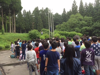 今日から3泊2日お世話になる、ビレッジの方にご挨拶をしました。掲揚塔には、校旗をあげました。
