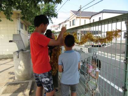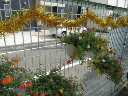 先日、7月6日に環境委員会では夏の花「ポーチュラカ」を植え、学校のフェンスに飾りました。その時、カラス除け対策で金銀モールを張り替えて飾りました。このモールは効果があります。