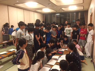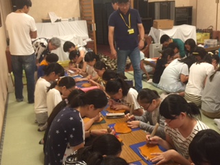 夕食後、日光彫り体験をしました。初めて見る、刃先のまがった彫刻刀を使いました。使い始めは難しかったのですが、彫り進めるうちに上手になりました。