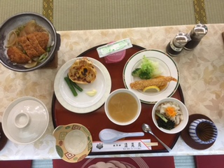 今日の夕食も、豪華なメニューです。この後、室内レクの時間です。よく噛んで食べましょう。