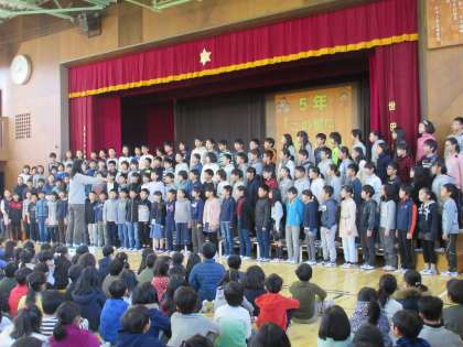 今日の音楽集会は、5年生の合唱でした。歌った曲は『この星に生まれて』です。声変りがこれから始まる高学年ですが、きれいな歌声を聞かせてくれました。