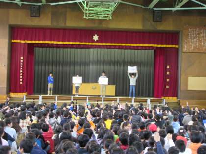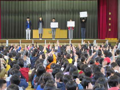 本日は、児童集会でオリンピック・パラリンピックのクイズ集会を行いました。いろいろな種類の質問があり、楽しんで行いました。
