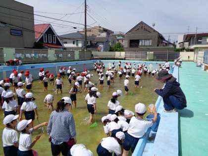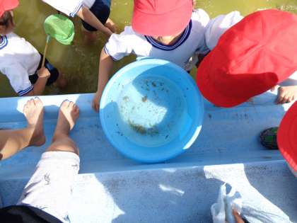プール清掃の前に2年生がヤゴ採りをしました。たくさん採れたかな。