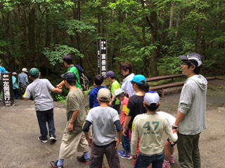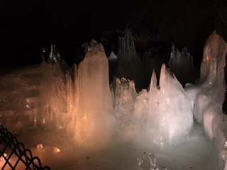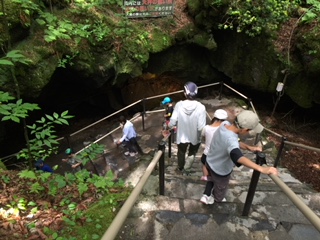 富岳風穴という場所に到着しました。富士山の噴火によってできた洞窟です。中はとても涼しかったです。