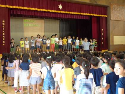 「あしたは晴れる」6組の気持ちのいい歌声に合わせて、全校でリズムをとって暑さに負けないように歌いました。
