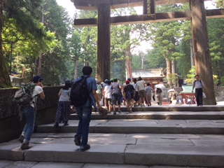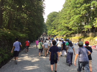 東照宮に到着しました。陽明門や眠り猫など、世界遺産の迫力に圧倒されました。中は樹木が多く木陰も多く、大分暑さをしのぐことができました。