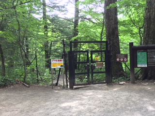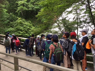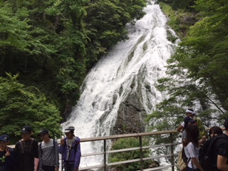 湯滝の下に到着。グループで記念写真を撮りました。お弁当と水を受け取り戦場が原へと向かいます。湯滝付近の標高は1400m、気温は25度前後です。直射日光が少なく、過ごしやすい状態が続いています。