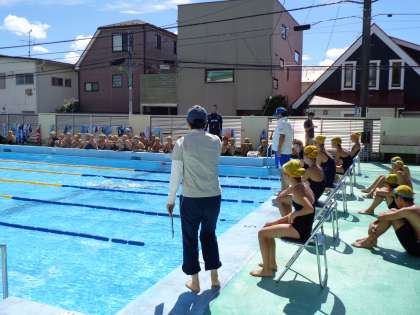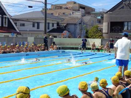晴天の下、自己最高タイムを目指して6年間の集大成の泳ぎで頑張りました。