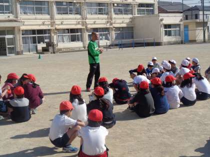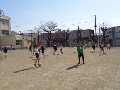 日差しが暖かくなりました。ゲストティーチャーを招いて、サッカーをベースに楽しく運動できました。