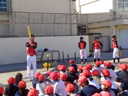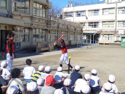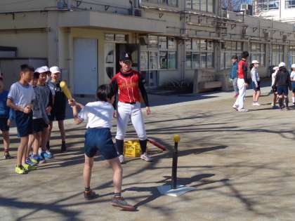 ゲストティーチャーを招いて、Tボールの学習をしました。打つ時のポイントを習い、思い切って打ってみました。