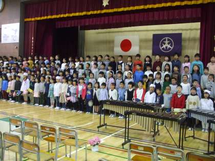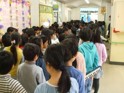 2年生が「ようこそ弦巻小へ」の気持ちを込めて、1年生を迎えました。