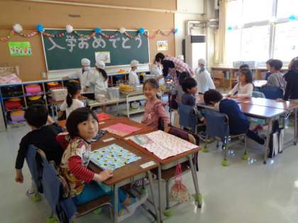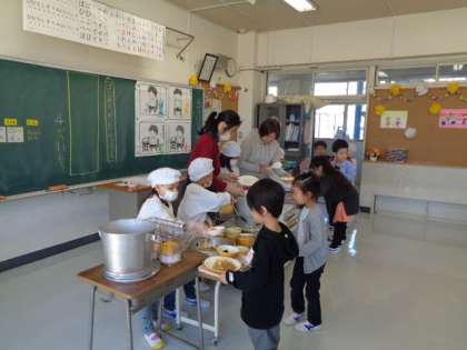 給食と番が配膳します。きちんと並んで給食を受け取ります。