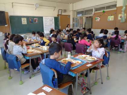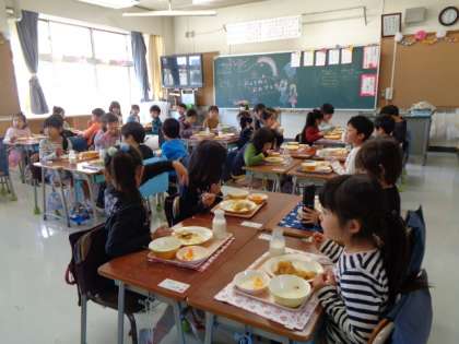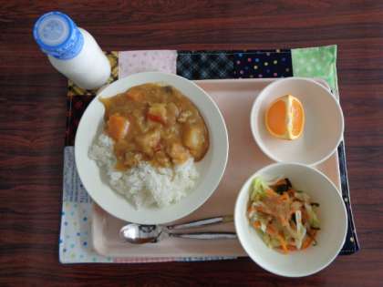 子どもたちの人気のカレーライスが1年生の初めての給食です。おいしくいただきました。