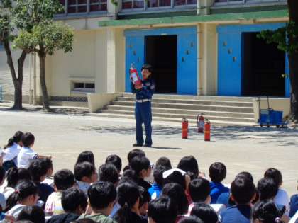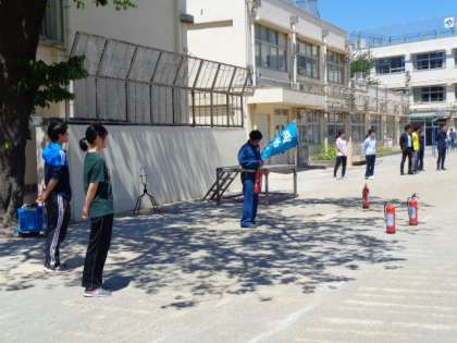 1年生が初めて参加した避難訓練でした。自分の身は自分で守れるように、ハンカチを身につけましょう。消火器の使い方も教わりました。