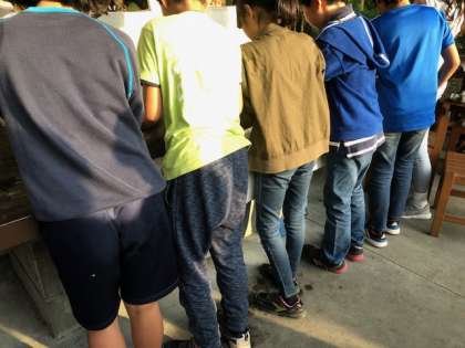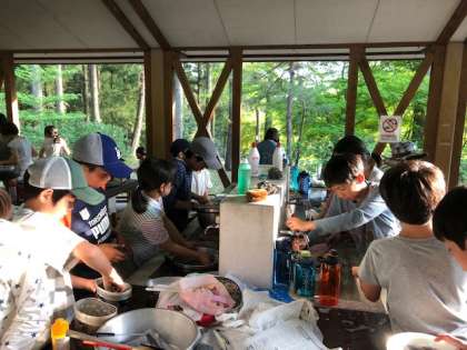 最後の片付けが大変なんです。鍋の周りの黒いすすや、飯盒の中も完全に綺麗にします。水が冷たいですが、みんな頑張ってます。