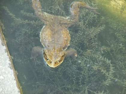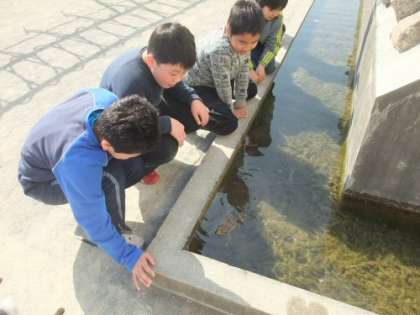 校庭にある観察池に、カエルが出てきました。本格的な春がやって