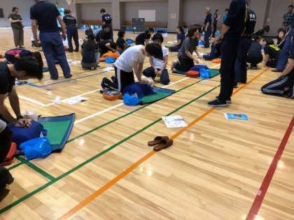 水泳の授業を控え、松丘小学校と合同で、救命救急研修が行われました。