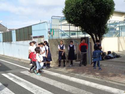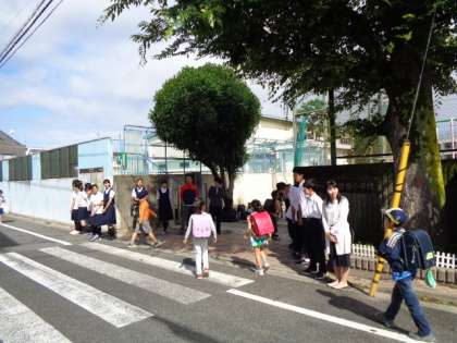 駒沢中学校から中学生が登校前に弦巻小学校に来て、さわやかなあいさつをしてくれました。