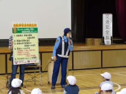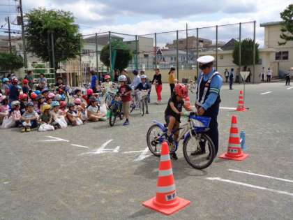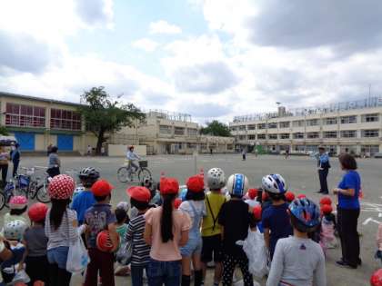 警察の方をゲストティーチャーに招いて自転車教室を開催しました。安全に乗れるようにしましょう。