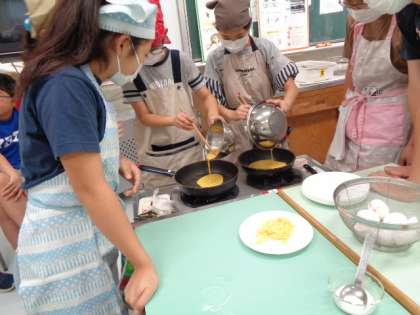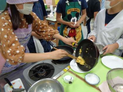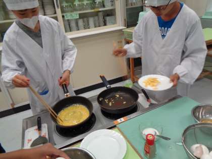卵を使った調理実習です。一人ひとりフライパンを使って調理しました。