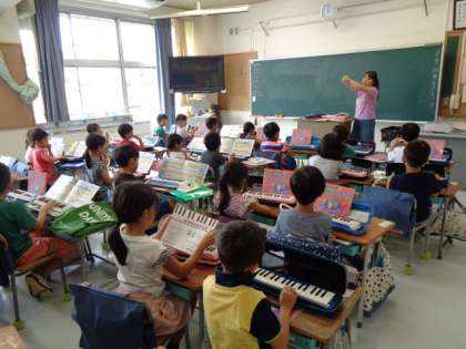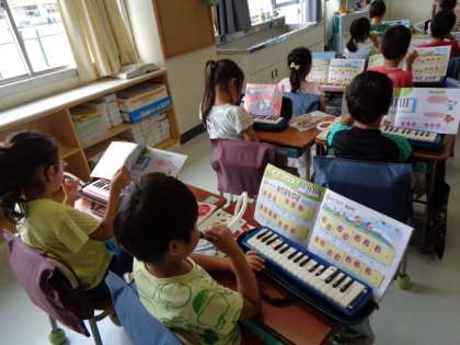 鍵盤ハーモニカの学習です。上手に弾いけるかな。