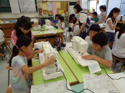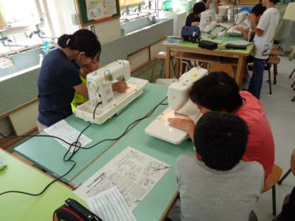 ミシンの学習が始まりました。よい姿勢で真っ直ぐ縫えるように、ペアで声を掛け合いました。