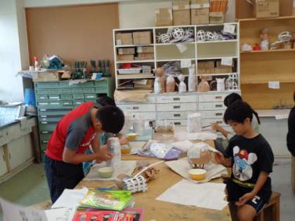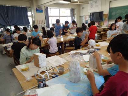 「ピカピカランプシェード」を作成しています。自分のアイディアの形に様々な材料と使って成形しています。