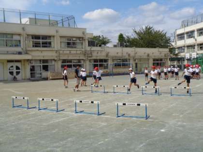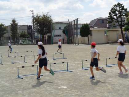 ハードル走の学習です。2つ以上のハードルをリズミカルに跳びこして走るにはどんな工夫が必要か考えます。