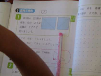 折り紙を使って直角三角形を作りました。同じ大きさのものがうまくできたかな。