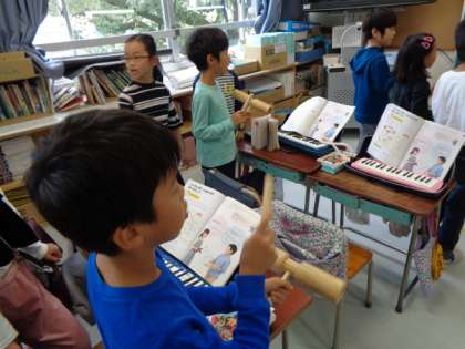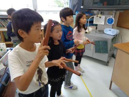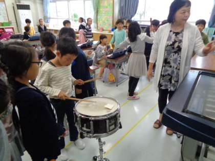 いろいろな楽器を奏でてみる体験です。リズムよくたたけるかな。