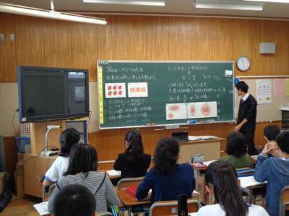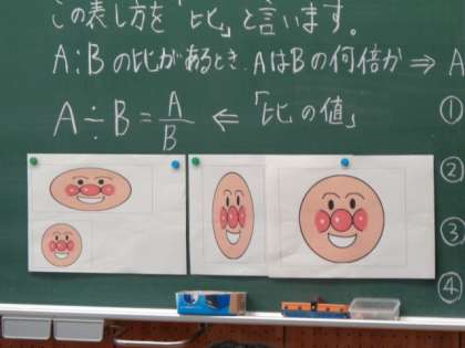 「比とその応用」の学習が始まりました。キャラクターの縦の長さと横の長さを比で表しました。
