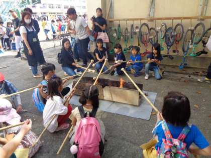 かまどで「遊ぼうパン」を焼いて、食べます。毎年大人気です。