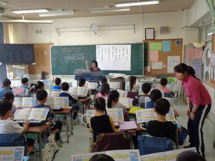 「よろこびのうた」を鍵盤ハーモニカで演奏します。1段ずつ練習しています。
