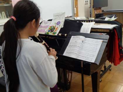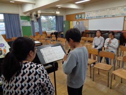 歌に続き、リコーダーのテストが始まりました。音楽室で一人ずつ演奏しています。緊張した面持ちです。