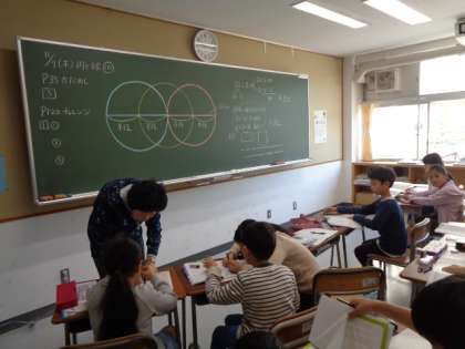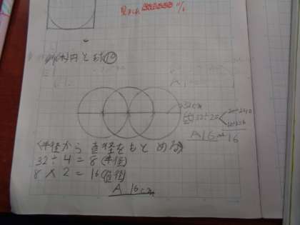 『円と球』の学習です。コンパスを使って、円をかいて学習しました。