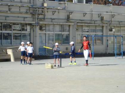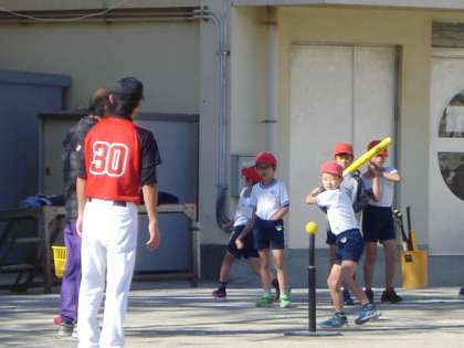 投力低下は本校だけでなく全国的な課題です。本校の広い校庭で、思い切り投げて打つという経験をし、子供たちも満足そうな表情でした。