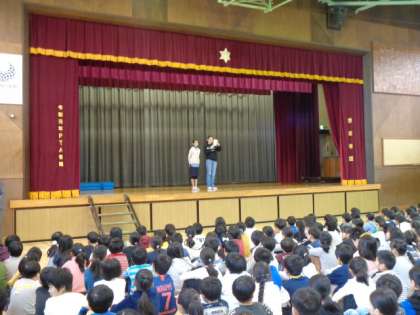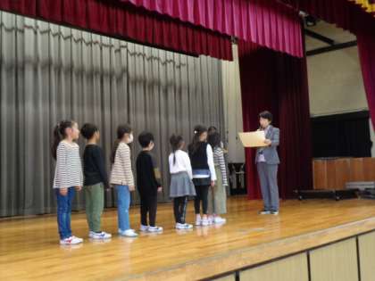 校長先生のお話の後、1年生の消防写生会の表彰。ボランティアの活動報告、代表委員会からあいさつ運動の呼びかけ、図書委員会から読書週間のお知らせ、盛りだくさんの朝会でした。