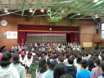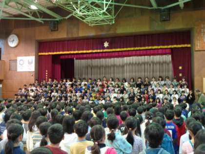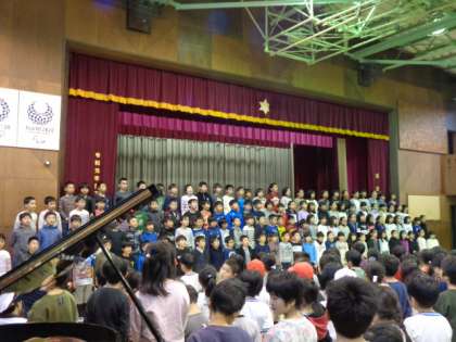 4年生が全校児童にリコーダー「茶色の小びん」合唱「チャレンジ」を披露しました。その後、全校合唱で「君をのせて」を歌いました。
