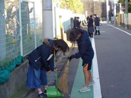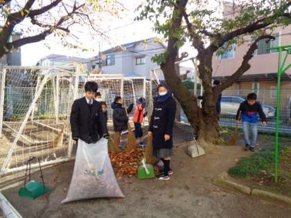 とても寒い朝でしたが、弦巻中学校の生徒と弦巻小学校の環境委員会の子どもたちと一緒に落ち葉掃きをしました。細かいところまできれいにしてくれました。