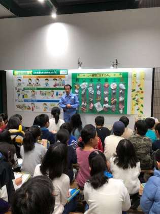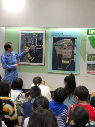 環境学習ホールで、埋め立ての仕組みや方法、ゴミ問題についてを学習しています。ゴミを減らさないと本当に大変なことになるんです。みんな真剣に学んでいます。