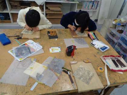 『回転模様は美しい』彫刻刀を使って細かく版画を作りました。カラフルなインクを使って刷る予定です。