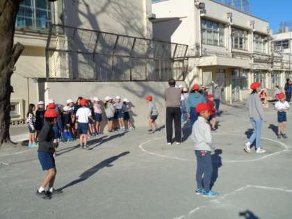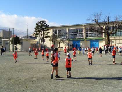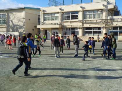 今朝は冷え込みましたが、2年生と6年生が交流遊びで元気に校庭を走り回っています。左手で投げるドッジボールやスキップで追いかける鬼ごっこなど工夫して遊びました。