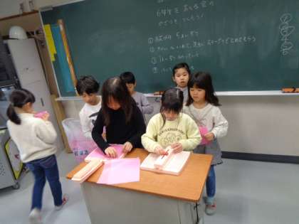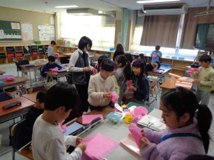 6年生を送る会に向けてお花紙でお花を作りました。たくさん作って体育館を飾ります。