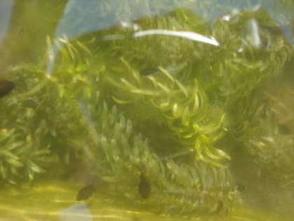 校長室の前のオタマジャクシには後ろ足がはえてきました。