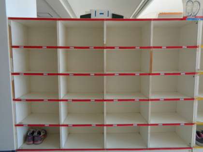 赤いテープの靴箱が1組、黄色が2組、青が3組、緑が4組です。