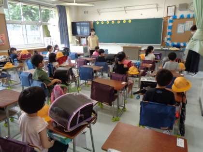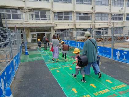 曇り空ですが、雨は上がりました。初めて登校する1年生のBグループがお家の方々と一緒に登校してきました。3時間分の学習をします。